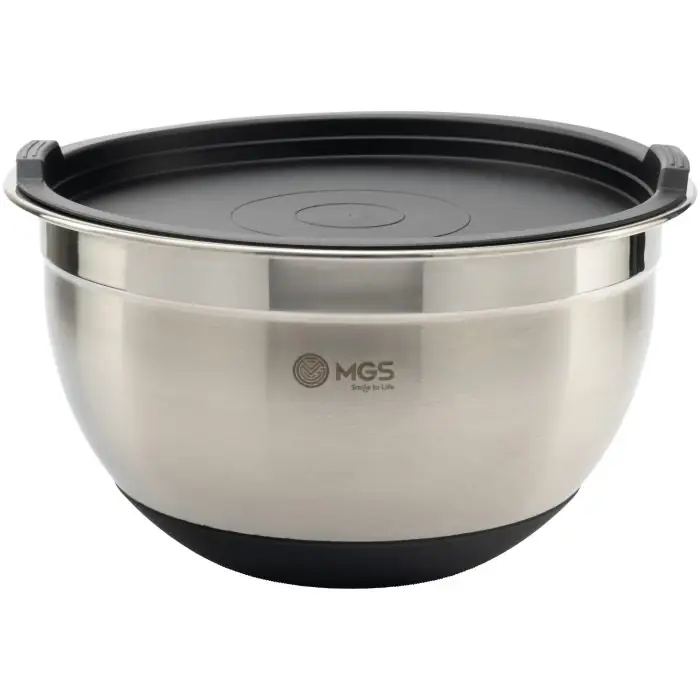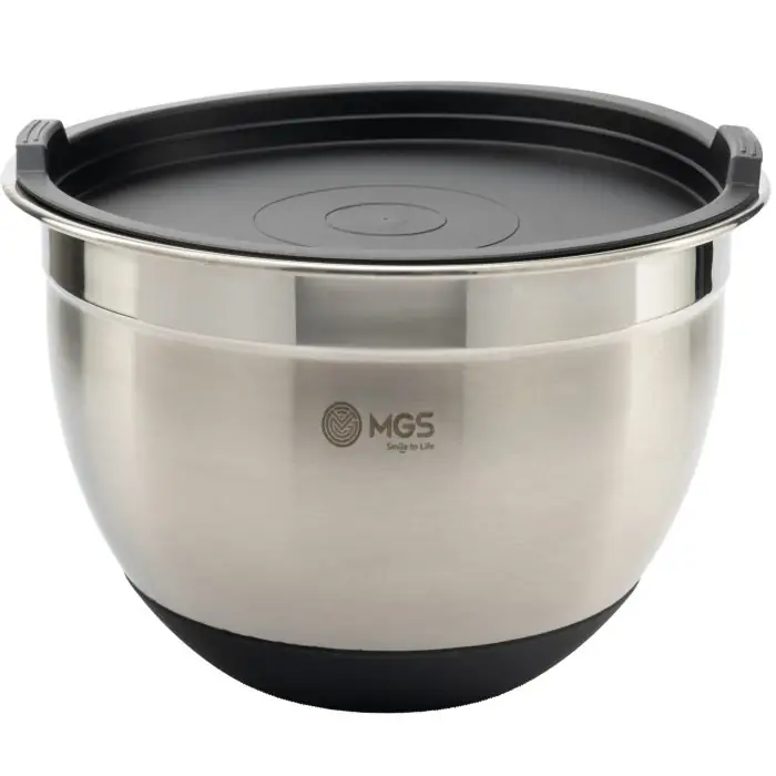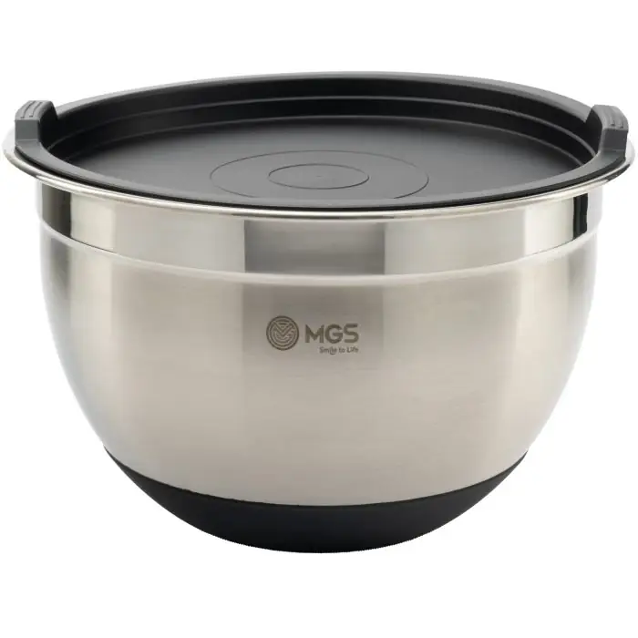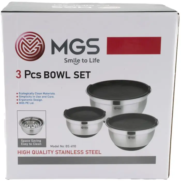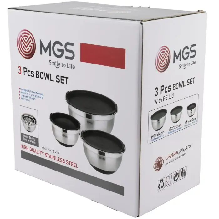 ست کاسه استیل درب دار ام جی اس کد bs4110، یک سرویس ابزار آشپزخانه 6 پارچه شامل سه کاسه در سه سایز بزرگ، کوچک و متوسط همراه سه درب است. این سرویس مناسب استفاده در منزل یا کافه و رستوران برای شستشو و نگهداری مواد غذایی است.