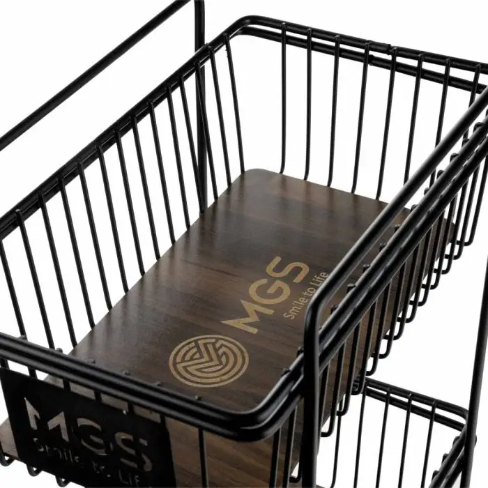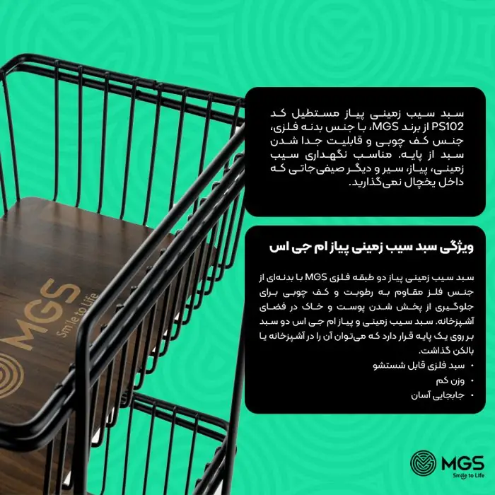 سبد سیب زمینی پیاز دو طبقه فلزی MGS با بدنه‌ای از جنس فلز مقاوم به رطوبت و کف چوبی برای جلوگیری از پخش شدن پوست و خاک در فضای آشپزخانه. سبد سیب زمینی و پیاز ام جی اس دو سبد بر روی یک پایه قرار دارد که می‌توان آن را در آشپزخانه یا بالکن گذاشت.