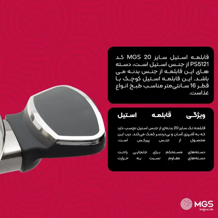 قابلمه استیل سایز 20 MGS کد PS5121 از جنس استیل است، دستههای این قابلمه از جنس بدنه میباشد. این قابلمه استیل کوچک با قطر 20 سانتیمتر مناسب طبخ انواع غذاست.